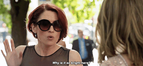 Alex Danvers (Chyler Leigh) from Supergirl, wearing sunglasses and asking why it's so bright.