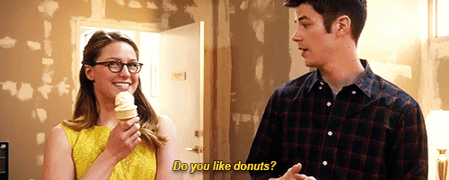 Kara Danvers (Supergirl) holding an ice cream cone, asked 'Do you like donuts?' by Barry Allen.