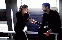 Kara and Mon-El from Supergirl share a significant handshake, sealing a deal.