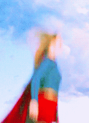 Supergirl Kara Zorel in her iconic costume, looking determined against a bright sky.