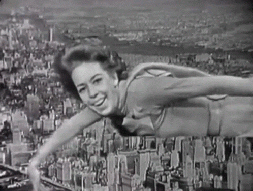 Carol Burnett as Supergirl Superwoman joyfully flying high above a city in this classic black and white clip.