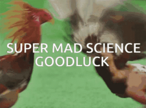 A chicken moving erratically with the text 'SUPER MAD SCIENCE GOODLUCK' overlaid.