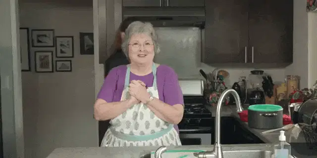 An animated granny, Oma Doris, cheering excitedly in a grocery-filled shopping cart in a supermarket.