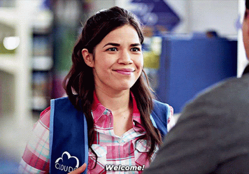 America Ferrera as Amy Dubanowski (Amy Sosa) from Superstore, smiling and saying 'Welcome!' to a customer.