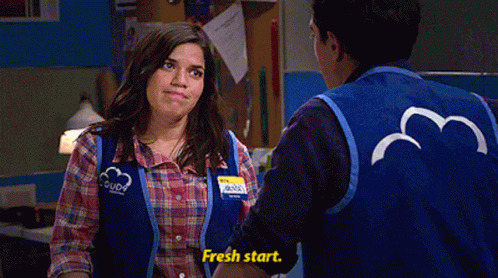 Amy Sosa (America Ferrera) in Superstore, wearing a Cloud 9 vest, says 'Fresh start.' to a colleague.