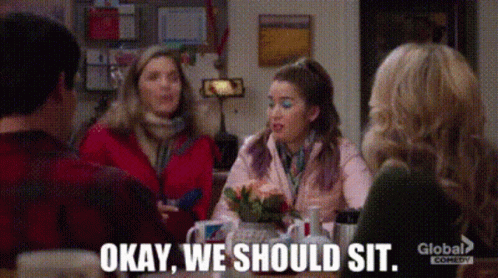Amy Sosa, played by America Ferrera, suggests 'Okay, we should sit' while at a table with friends in Superstore.
