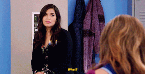 Amy Sosa, played by America Ferrera, reacts with a confused 'What?' in a scene from Superstore.