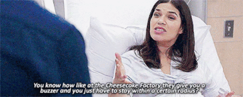 Amy Sosa from Superstore explains the Cheesecake Factory buzzer system while in a hospital bed.