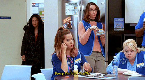 America Ferrera as Amy Sosa arrives late to the Superstore breakroom, apologizing for traffic.