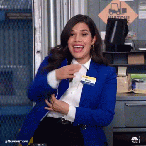 Amy Sosa from Superstore claps enthusiastically, wearing a blue jacket and a name tag.