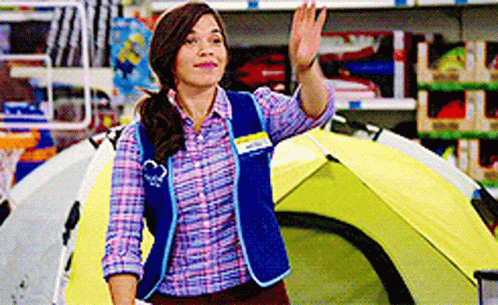 Amy Sosa, played by America Ferrera, makes a 'go ahead' gesture in Superstore, standing by a tent.