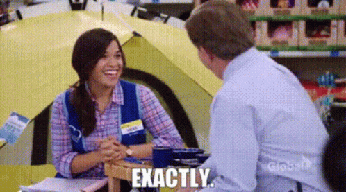 America Ferrera as Amy Sosa from Superstore smiles and laughs, agreeing with a man by saying "Exactly."