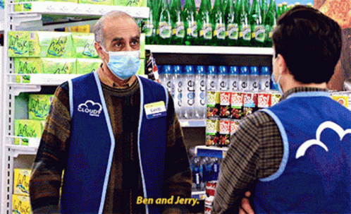 Superstore's Sayid (Amir M Korangy) holds a pint of Ben & Jerry's ice cream while talking to a colleague.