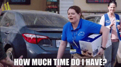 Dina Fox (Lauren Ash) from Superstore urgently asks 'How much time do I have?' while holding a box.