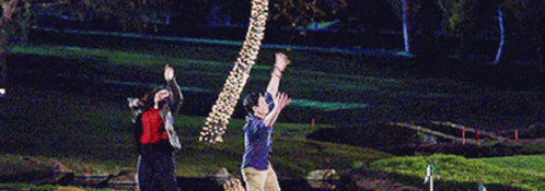America Ferrera (Amy Sosa) and Ben Feldman (Jonah Simms) celebrate a golf win in Superstore, raising their arms.