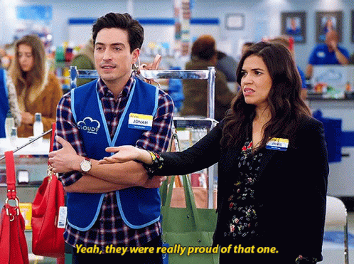 Jonah Simms (Ben Feldman) in Superstore, reacting to a proud moment, with Amy Sosa beside him.