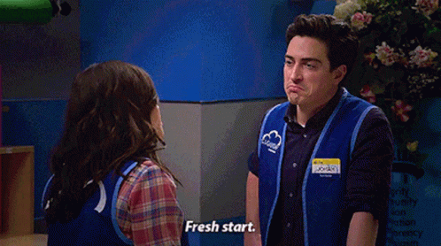 Jonah Simms (Ben Feldman) from Superstore says 'Fresh start' to a colleague, signaling a new beginning.