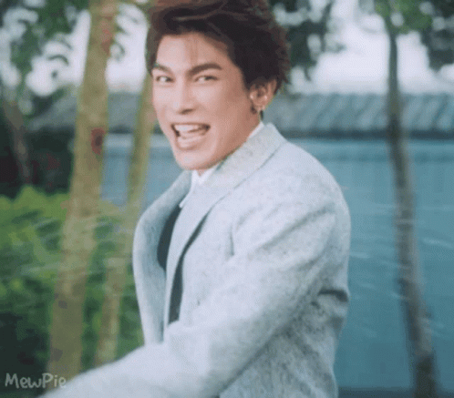 Mew Suppasit, also known as Mewpie, smiles brightly and gives a thumbs-up while wearing a light suit outdoors.