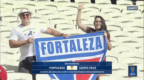 Proud Fortaleza fans, a man and a woman, cheer in the stadium, holding a large Fortaleza flag for the match against Santa Cruz.