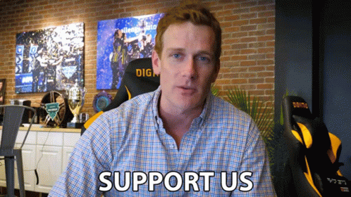 A man in a plaid shirt directly addresses the camera, asking for support.