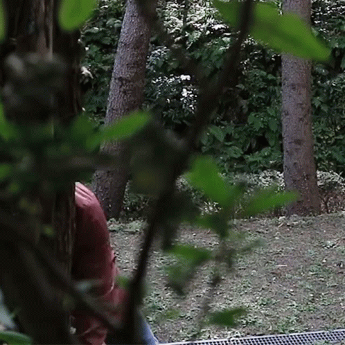 Kemushichan peeks from behind trees in the woods, smiling with a surprised expression, as if saying 'Here I Am'.