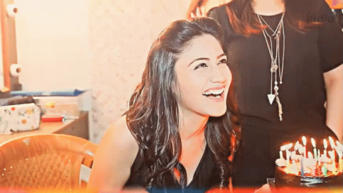 Surbhi Chandna smiles brightly, holding a chocolate birthday cake with lit candles during her celebration.