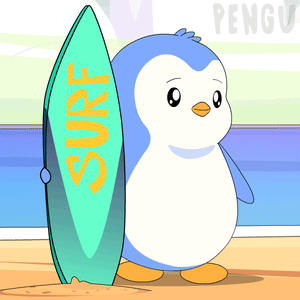 A cute cartoon pudgy penguin stands on a beach, ready to surf with its surfboard.