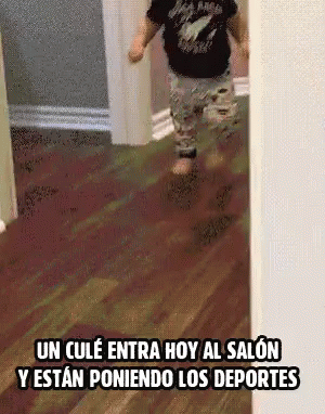 A baby runs into a room, sees sports on TV, and quickly hides, with a Spanish caption about a 'Culé' fan.