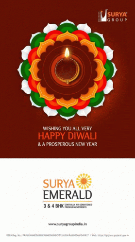 Surya Group and Surya Emerald extend warm wishes for a Happy Diwali and a Prosperous New Year, featuring a traditional diya.
