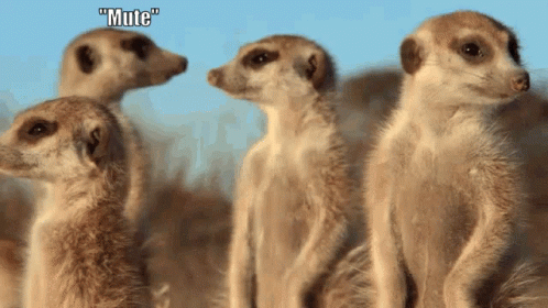 A group of meerkats in a popular meme format, reacting to the word 'mute' in Polish.