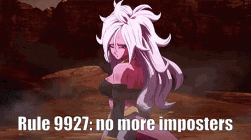Android 21 from Dragon Ball FighterZ enforces Rule 9927: no more imposters, with a menacing look.