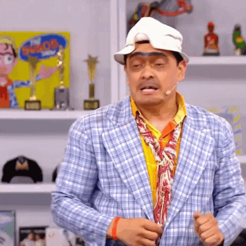 Suso El Paspi makes an expressive gesture on the set of El Show De Suso, wearing his signature hat and plaid jacket.
