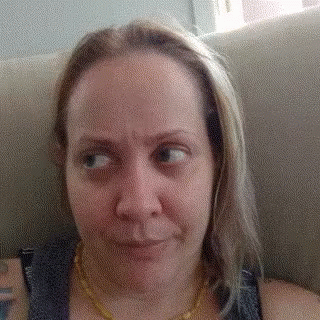 Woman on a couch gives a suspicious, shifty-eyed look with a slight smirk, conveying awkwardness.