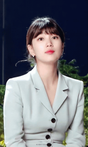 Bae Suzy (수지) smiles charmingly while wearing a stylish light-colored suit, looking elegant and graceful.