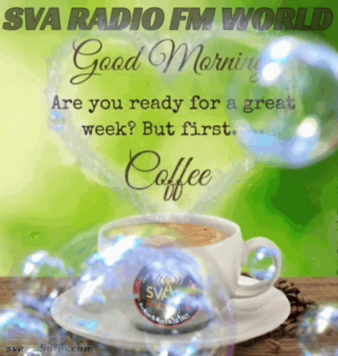 A 'Good Morning' message from SVA Radio FM World, featuring a cup of coffee and bubbles.