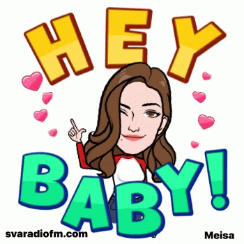 Animated cartoon woman winks and points, with 'HEY BABY!' text, promoting Sva Radio FM.