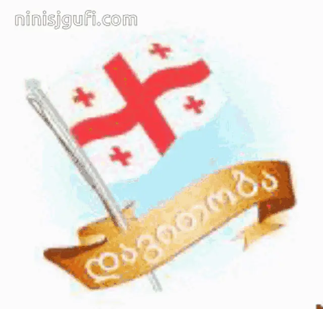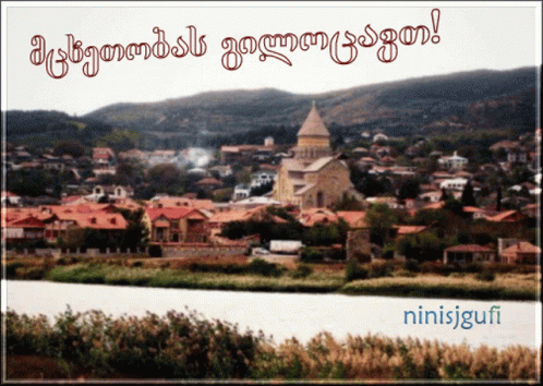 A scenic postcard view of Mtskheta, Georgia, featuring Svetitskhoveli Cathedral, a river, and mountains.