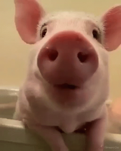 A cute pig making kissing motions with its snout, looking directly at the camera.