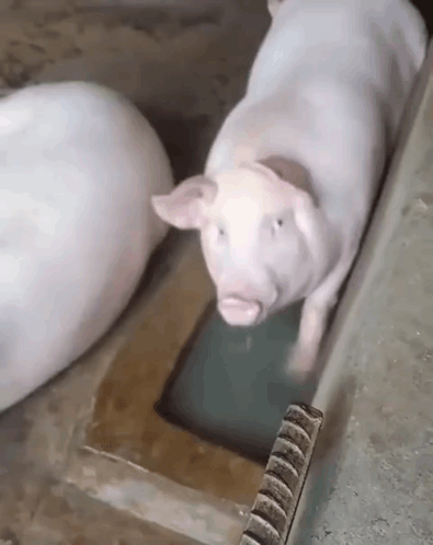 A white pig drinks water from a trough in its enclosure, with another pig nearby.
