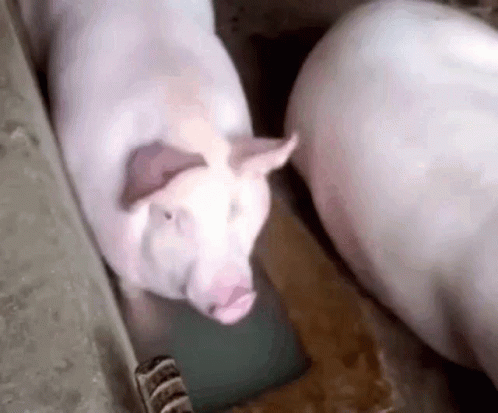 A large pink pig drinks water from a trough, then looks directly at the camera.