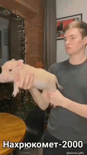 A man holds a small, light-colored piglet, which makes grunting sounds, with the text "Nakhryukomet-2000" on screen.
