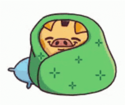 Svino Stikers, a cute cartoon pig, is happily wrapped in a warm green blanket, looking cozy and content.