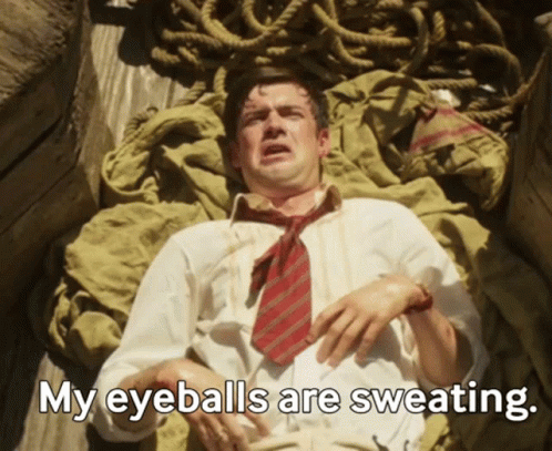 Jack Whitehall as Macgregor Houghton, drenched in sweat, exclaims "My eyeballs are sweating" in Jungle Cruise.