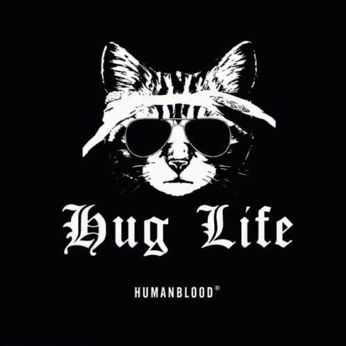 A black and white illustration of a cat wearing a bandana and sunglasses, with the text "Hug Life" below.
