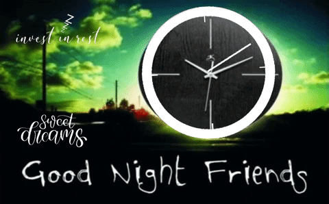 An animated graphic featuring a clock, with text 'Good Night Friends', 'sweet dreams', and 'invest in rest'.