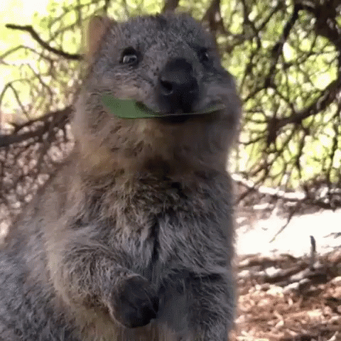 A cute quokka happily munching on a green leaf, showing its adorable smile.