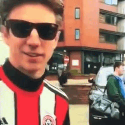 A young Sheffield Wednesday fan in sunglasses and a red and white striped shirt smiles and says 'Wawaw'.