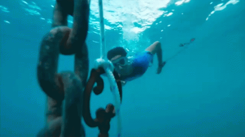 A person swims and dives underwater, exploring a large metal chain and an anchor in clear blue ocean water.