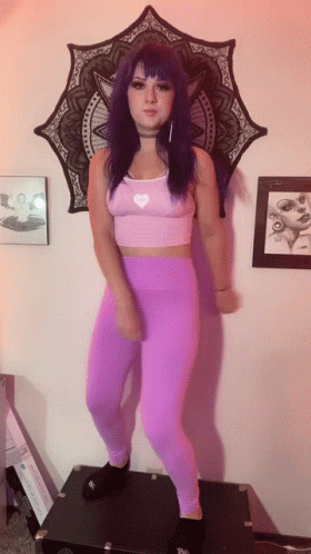 Jade Galaxy with purple hair and elf ears performs an arm dance in a pink top and purple leggings.