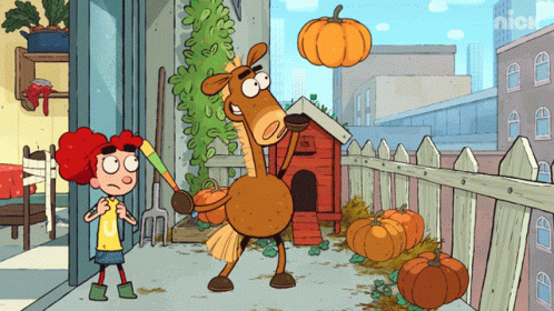 Pony Bramley swings a pumpkin with a broom, while Annie Bramley watches on a balcony.